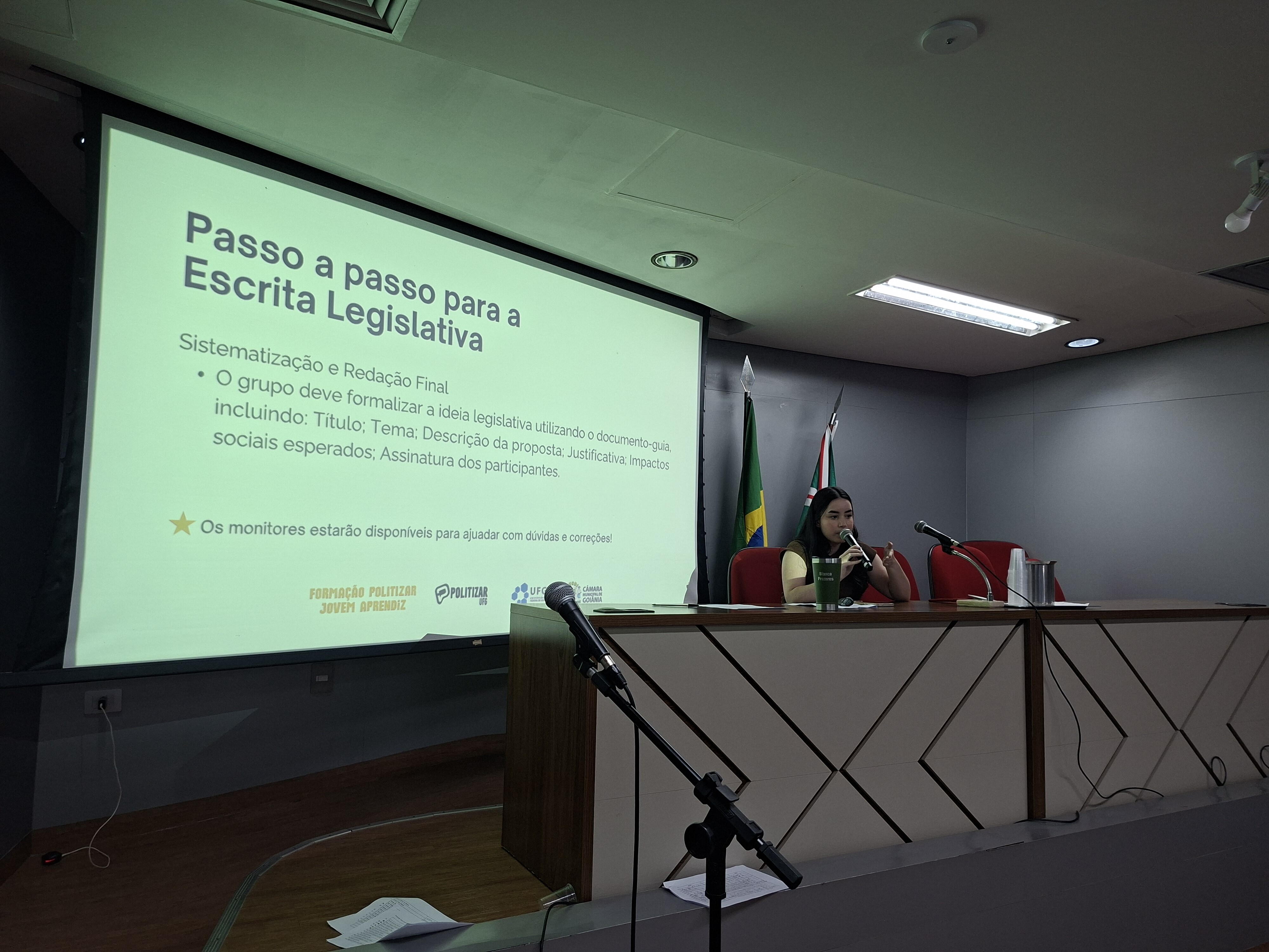 A membro da equipe Ana Flávia Aguiar apresentou o funcionamento da Oficina Legislativa, explicando como os jovens, em grupo, desenvolveriam uma ideia legislativa de políticas públicas no segundo dia da formação.